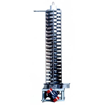 垂直提升機的驅動裝置振動電機安裝在輸送塔下部,兩臺振動電機對稱交叉安裝,輸送塔由管體和焊接在管體周圍的螺旋輸送槽組成,輸送塔座于減振裝置上,減振裝置由底座和隔振彈簧組成。當垂直提升機工作時,根據雙振動電機自同步原理,由振動電機產生激振力,強迫整個輸送塔體作水平圓運動和向上垂直運動的空間復合振動,螺旋槽內的物料則受輸送槽的作用,作勻速拋擲圓運動,沿輸送槽體向上運動,從而完成物料的向上(或向下)輸送作業,因此本設備也被成為振動垂直輸送機。