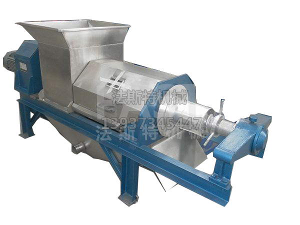 本為螺旋式壓榨,工作過程是:輸送螺旋將進入料箱的物料推向壓榨螺旋,通過壓榨螺旋的螺距減小和軸徑增大,并在篩壁和錐形體阻力的作用下,使物料所含的液體物(果汁)被擠壓出,擠出的液體從篩孔中流出,集中在接汁斗內,壓榨后的果渣,經篩筒末端與錐形體之間排出機外,錐形體后部裝有彈簧,通過調節彈簧的預緊力和位置,可改變排阻力和出渣口的大小,用來調節壓榨的干濕程度。