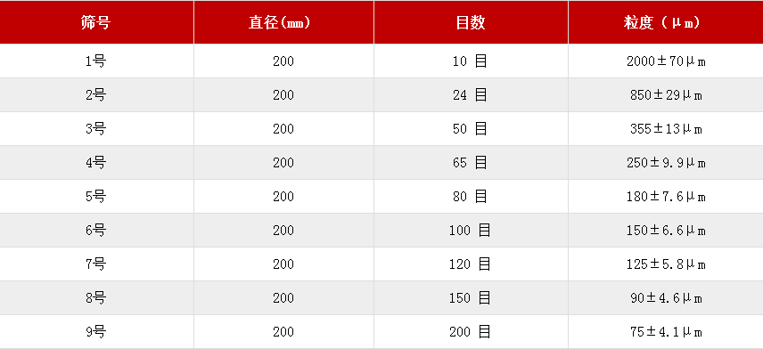 按照《中國藥典》規(guī)定,標(biāo)準(zhǔn)藥典篩網(wǎng)孔需符合GB/T6003-2012(即國際標(biāo)準(zhǔn)ISO3310),其網(wǎng)孔基本尺寸為金屬絲編織網(wǎng)試驗(yàn)篩2.36mm-0.020mm,篩網(wǎng)材質(zhì)需為不易和物料發(fā)生反應(yīng)的優(yōu)質(zhì)304不銹鋼構(gòu)成。國家規(guī)定的一套標(biāo)準(zhǔn)藥典篩由9個(gè)不同目數(shù)的篩格組成,依次按篩孔內(nèi)徑從大到小排成9個(gè)序號(hào),即從1號(hào)篩開始篩孔內(nèi)徑依次減小,9號(hào)篩的篩孔內(nèi)徑最小,檢驗(yàn)粒度最細(xì)。具體1~9號(hào)藥典篩目數(shù)對(duì)照表如下圖:
